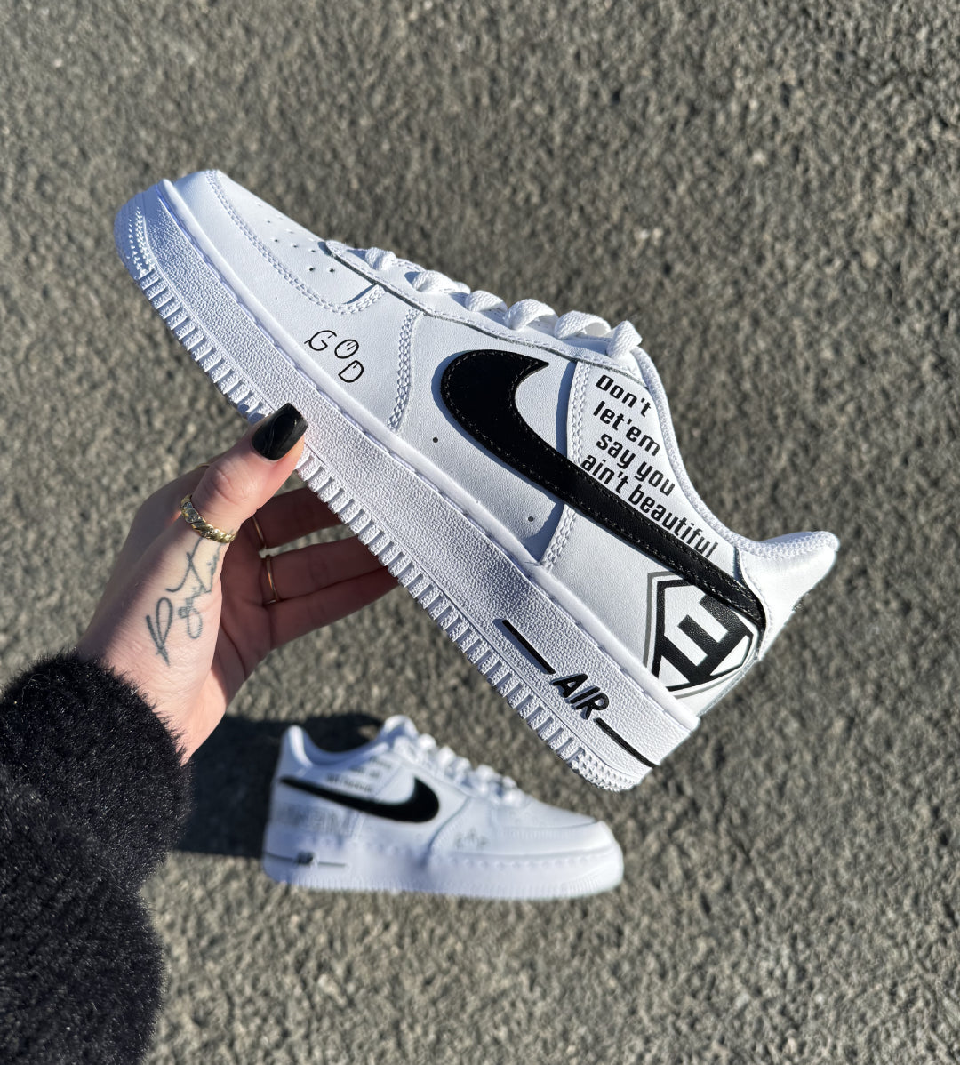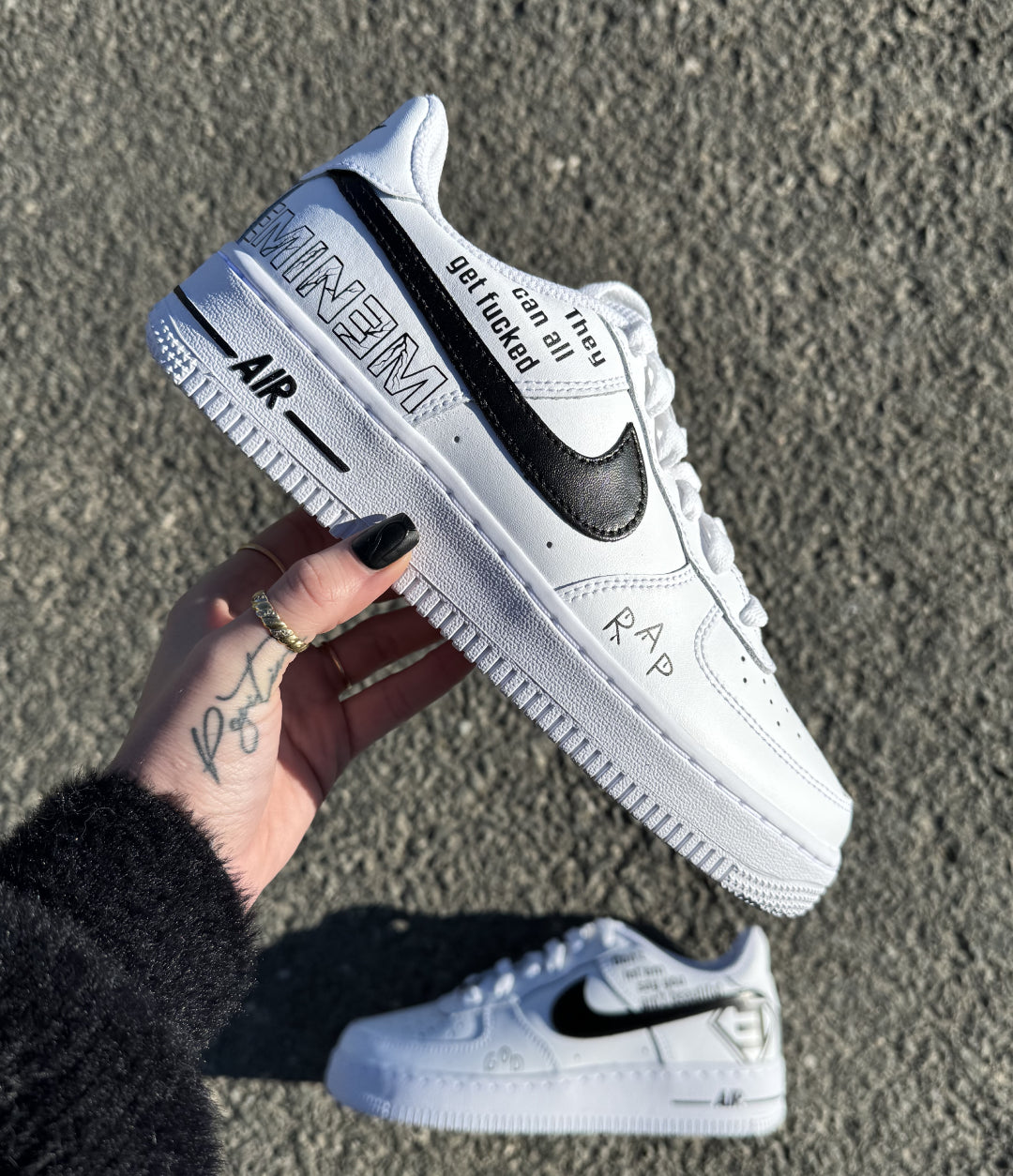 Nike Air Force 1 personnalisées – Eminem. Rendez hommage à la légende du rap avec ces Nike Air Force 1 personnalisées à la main, inspirées d' Eminem et de ses chansons les plus emblématiques.