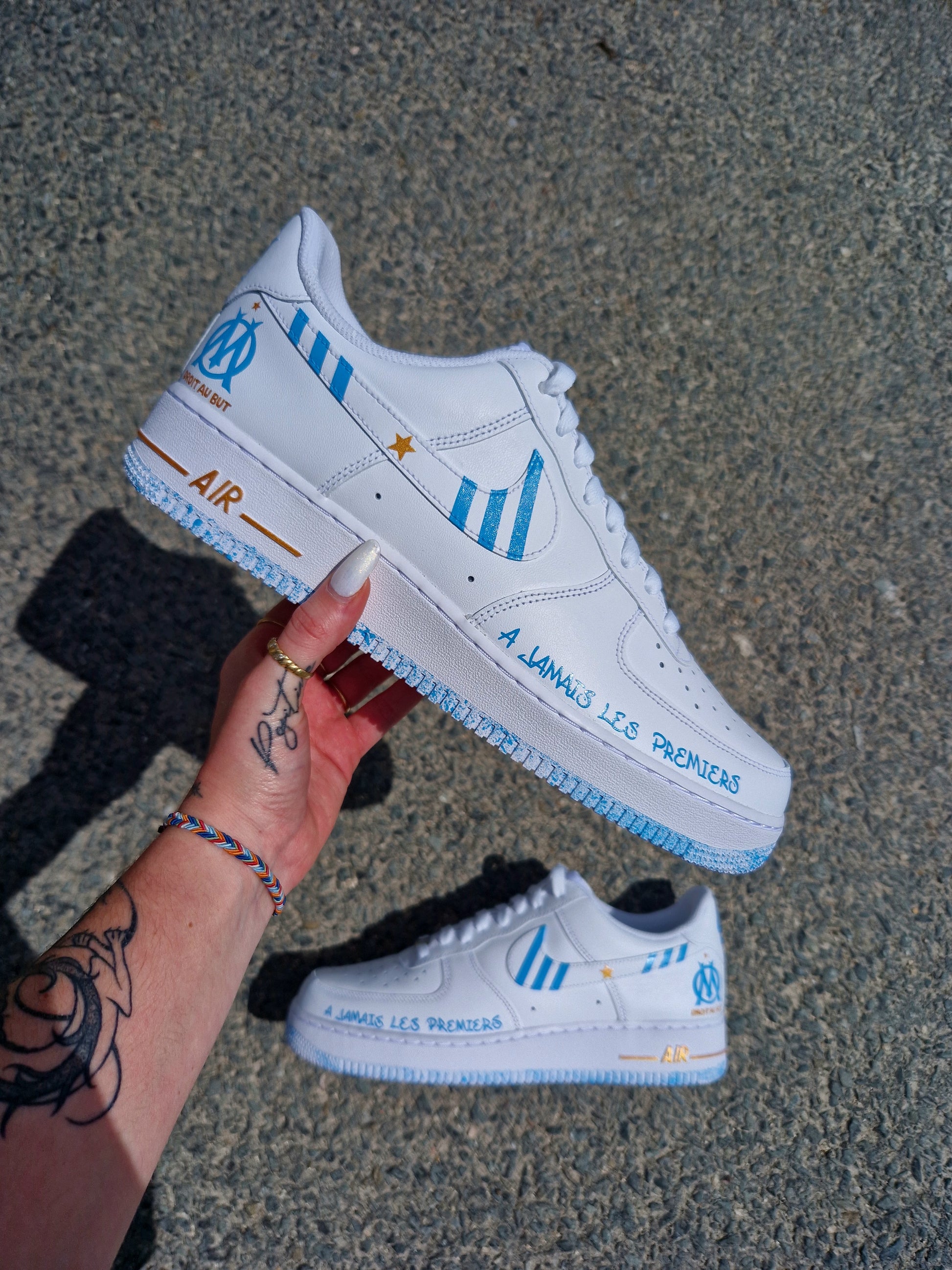 Nike Air Force 1 customisée OM Les Premiers : les 3 bandes Adidas surmontent les 4 logos Nike, avec une étoile dorée au centre. À l'avant, la mention « A jamais les premiers » et à l'arrière, le logo de l'OM. À l'avant, la mention « Droit au but » en doré. Une paire 100 % marseillaise.