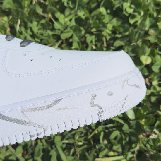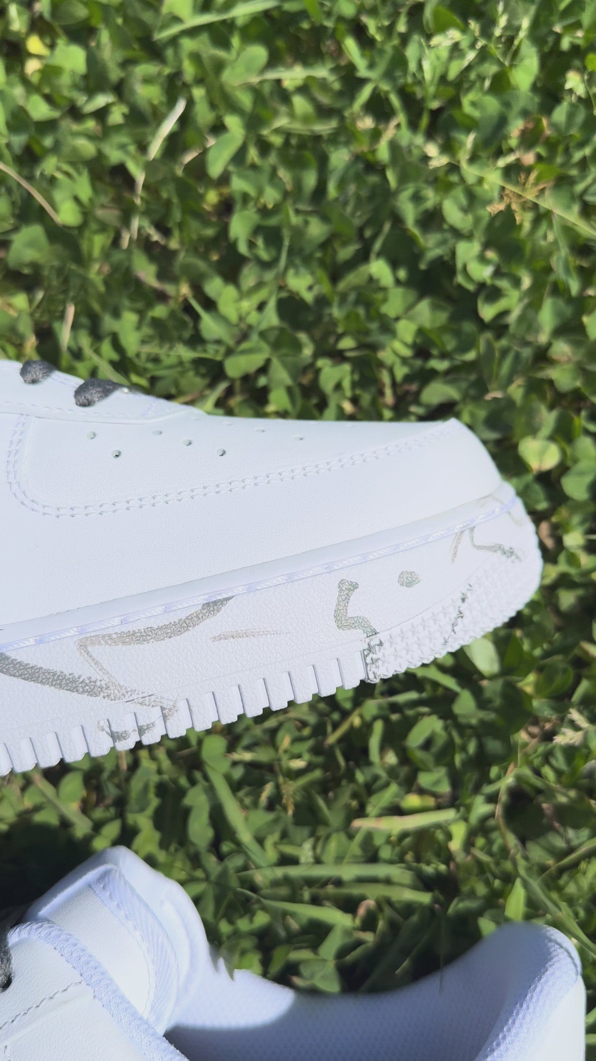 Nike Air Force 1 personalizada – Splash gris. Los 4 swoosh en degradado blanco-negro y salpicaduras grises pintadas a mano en los swoosh y la suela. Color por defecto: gris. ¡Posibilidad de elegir el color!